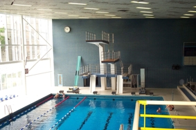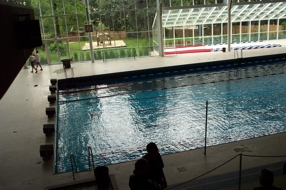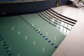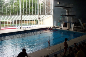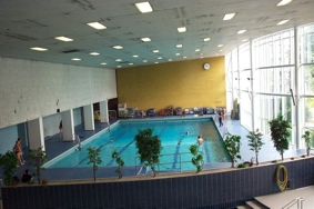 ist auch ein Treppeneinstieg, wo das Herausholen eines Ertrunkenen geprüft wird. Für Übungen mit Kindern, wie z.B. eine Spielstunde, ist das Becken besser geeignet als das Nichtschwimmerbecken, weil man hier gleich lange